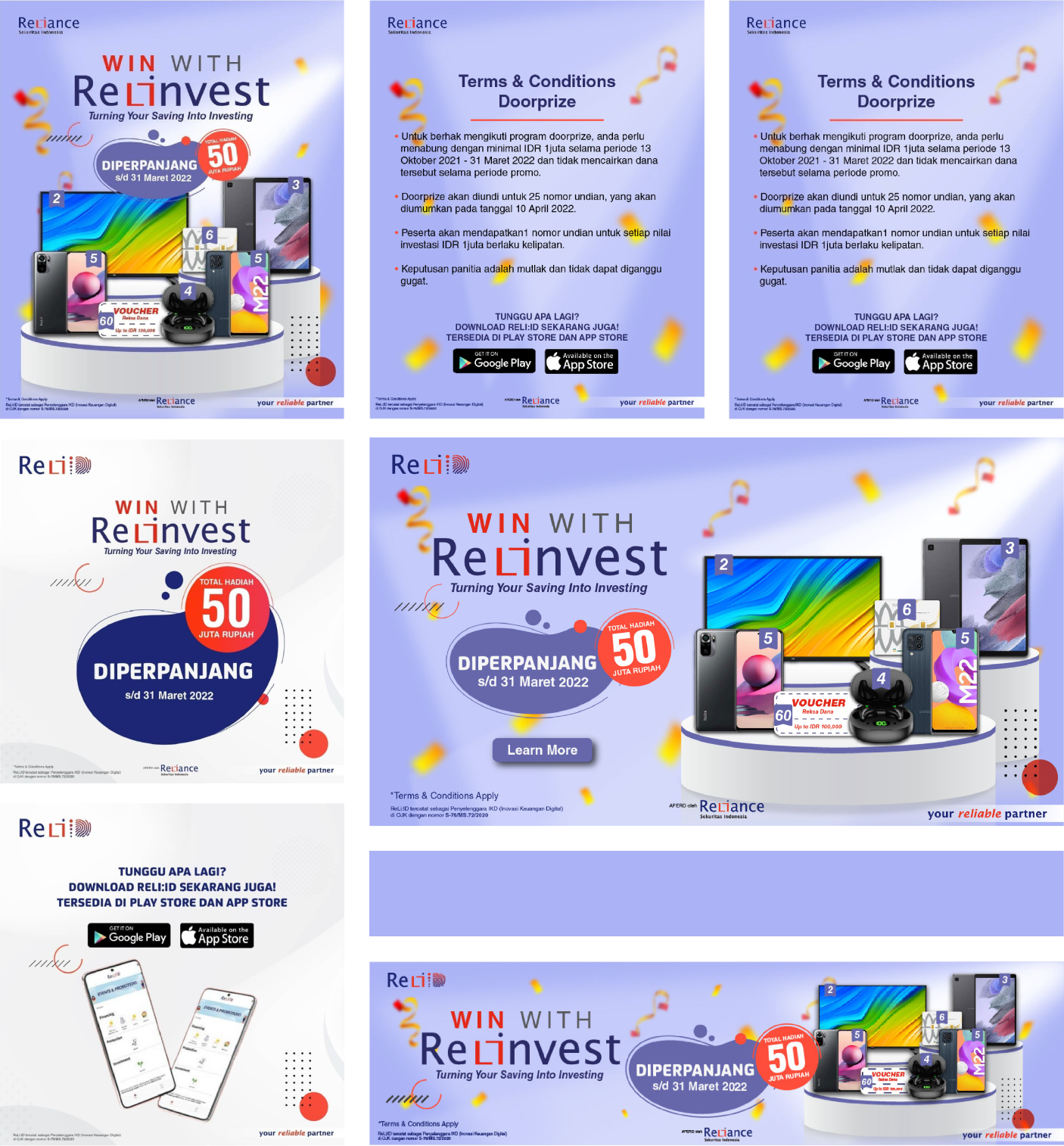 Win with Relinvest is a door prize program from Reliance. The promotional media created are posters, website homepage banners, and Instagram posts.
